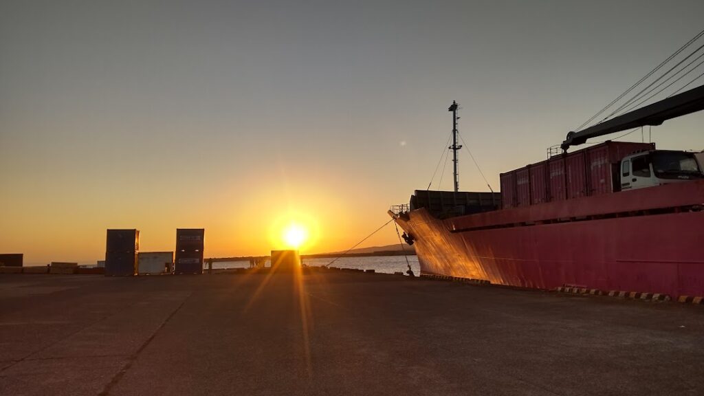 因みに 屋久島出航は8:00ですが、バイクや車は手続きなどの関係で7:00に来いということと、車は予約制ですが バイクは先着順らしいので、家を出たのは6:40分です。 あと2週間で冬至というこの季節 6:40は まだ真っ暗です。。。。 電話で7:00といわれたのに 受付開始はまさかの7:10から! で、先着順だと脅されたけど バイクや自転車は人っ子一人いない。( ;∀;) 車の方や トラックの方は 結構いました。。。港で乗船待ちをしていると 朝日が、、、 綺麗です! そして、人のみならず、牛も鹿児島に行くみたい、、、、可愛いです。(でも、きっと食べられてしまいます (( ノД`)シクシク…)